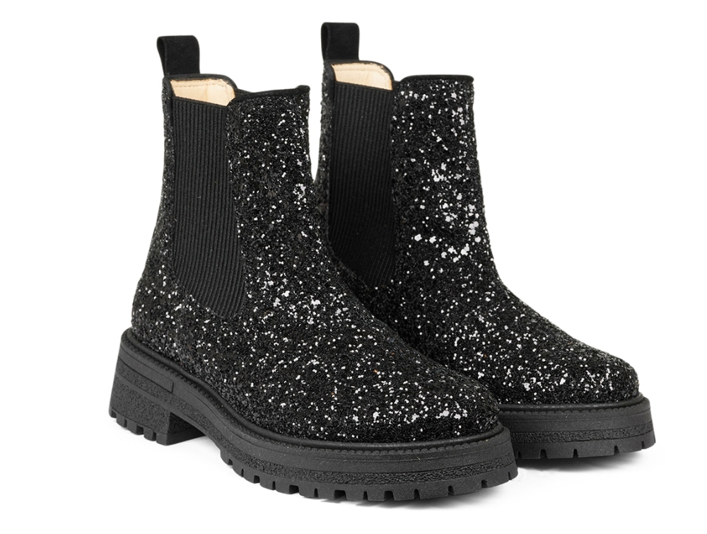 Chelsea boot in black glitter from Angulus with a chunky track sole. The style features elastic sides and a round toe, combining a classic Chelsea look with a modern twist. Best suited for children with medium to narrower feet. The boot fits normal to large in size.