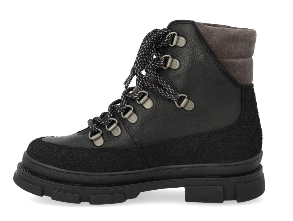 Chunky TEX winter boot in black leather from Angulus with a sturdy track sole. The boot is designed with a round toe, adjustable laces with reflective details, and a firm heel cap with padded suede collar for extra stability, support, and comfort. It is lined with soft leather, while the PFAS-free TEX membrane protects feet from snow, rain, and cold.