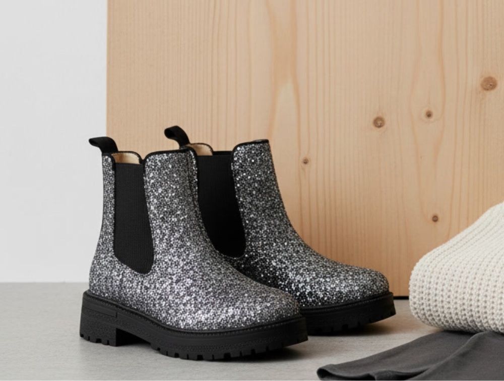 Boot in silver/lavender-colored glitter from Angulus. The boot has elastic on both sides and a raw edge along the sole.
