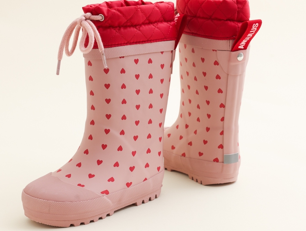 Pink winter rubber boot in natural rubber from Angulus with a charming heart print. The style features a quilted top with drawstring closure, logo pull strap at the back, and a reflective detail on the heel. Inside, the boot is lined with a mix of wool and polyester, making it suitable for cold and wet winter days. The boots run normal to slightly large in size.