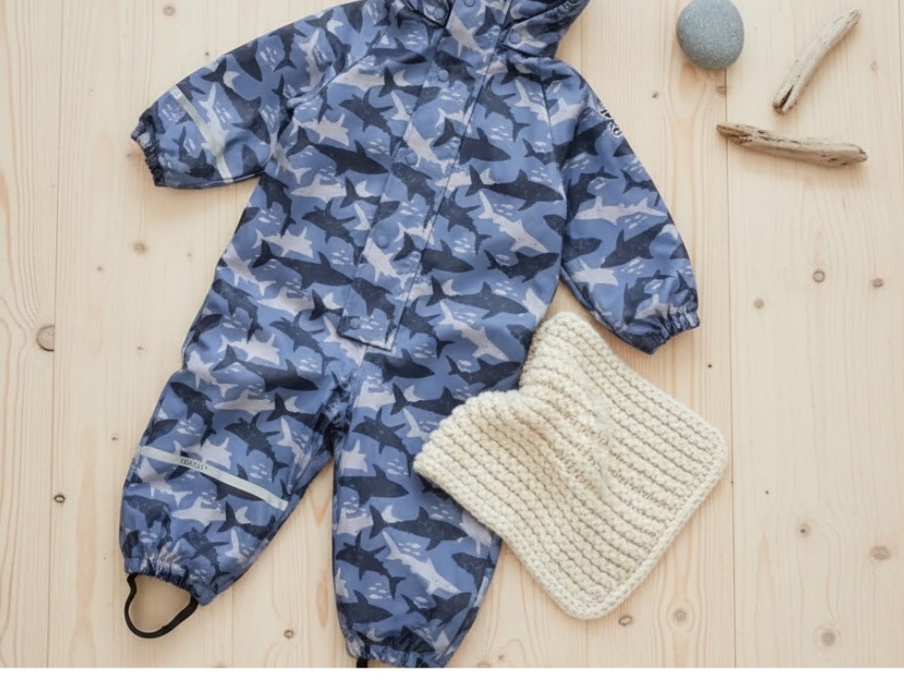 CeLaVi rainsuit blue sharks with fleece lining