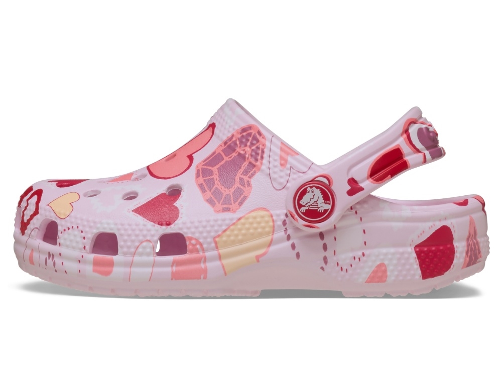 Crocs Classic clog in a light pink shade with heart print in red and pink tones is a lightweight and flexible sandal for kids. The surface is decorated with various heart shapes, creating a colourful look.