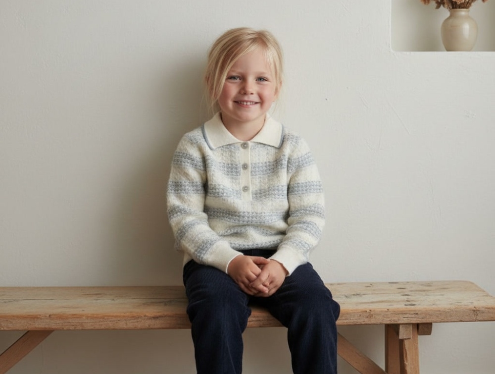 The blouse is knitted in extra fine merino wool in a two-tone pointelle structure and has a classic fit. It features a shirt collar with a contrast-colored edge, ribbed edges, and a front button closure with mother-of-pearl buttons.