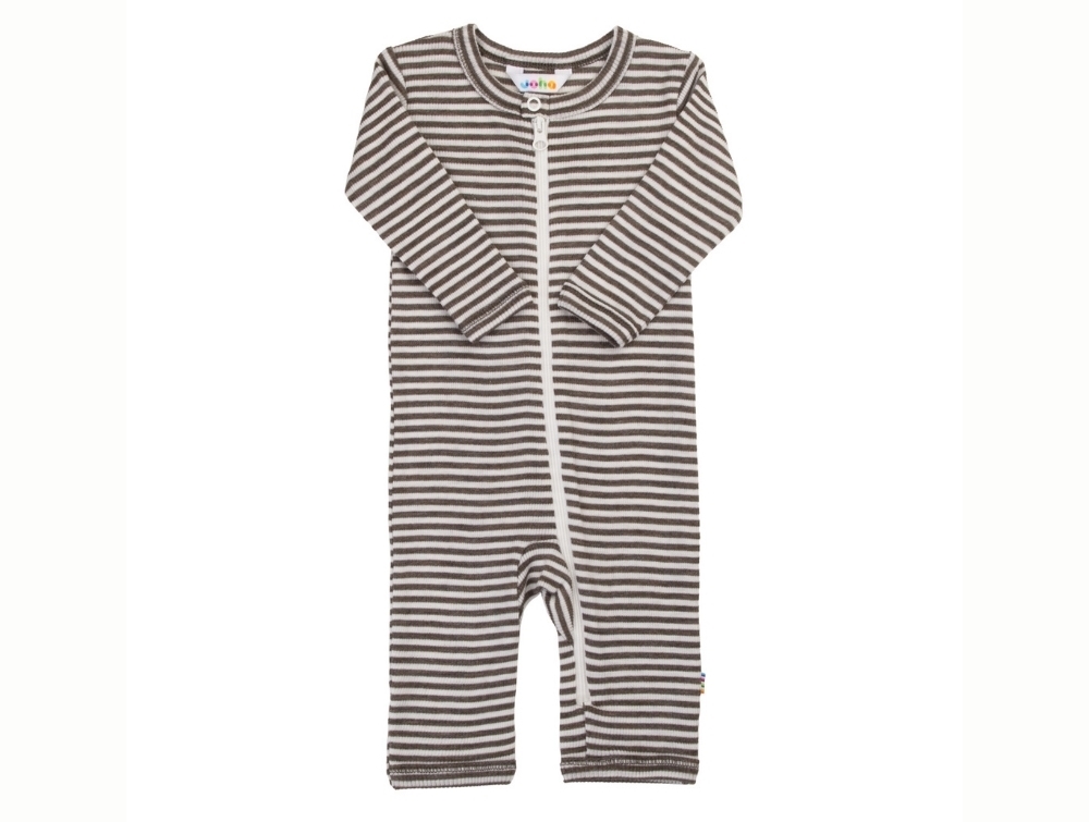 Striped jumpsuit in brown and off-white tones from Joha with narrow stripes and a fine rib texture.