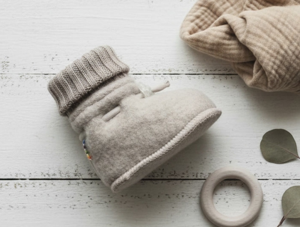 Always use wool detergent with lanolin – regular detergents can break down the fibers over time and make the fabric more fragile. With wool detergent, the booties will stay soft and nice for longer.