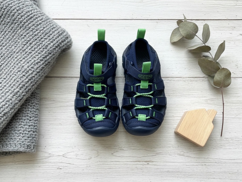 Sandal in a blue shade with green details from KEEN featuring a closed toe, elastic lacing and adjustable velcro strap. Hyperport H2 is a lightweight hybrid sandal made in quick-drying materials with soft cushioning and an extra thick midsole for comfortable everyday wear for active kids.