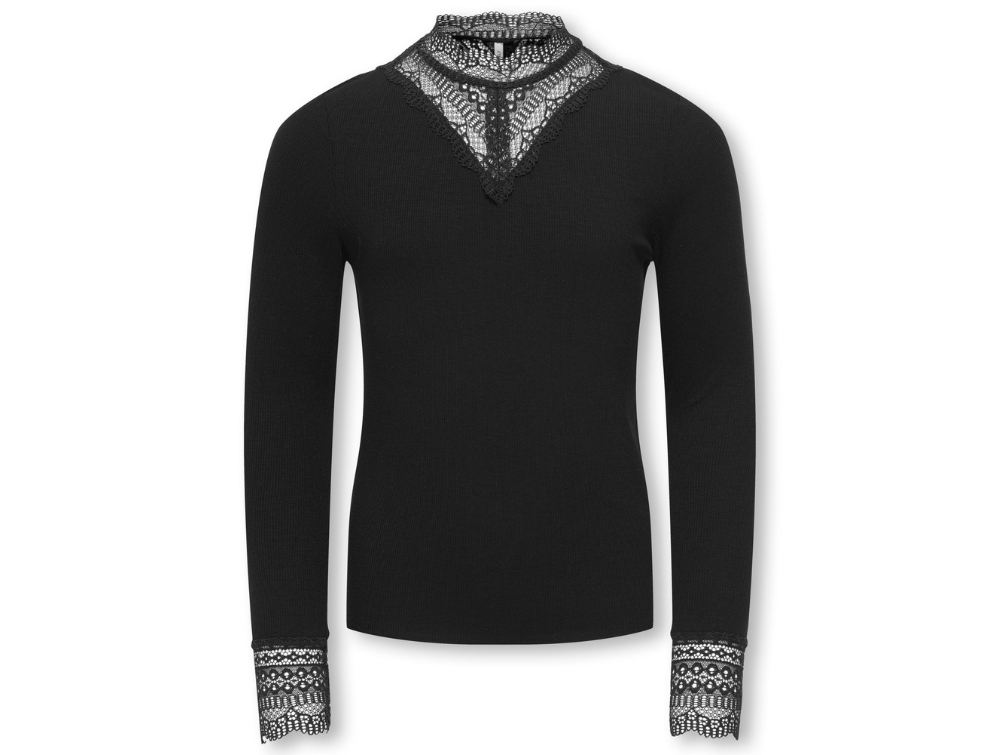 Black blouse from KIDS ONLY in soft, stretchy viscose with feminine lace details. Features a high lace neckline and lace panels at the front and cuffs for an elegant and decorative touch.