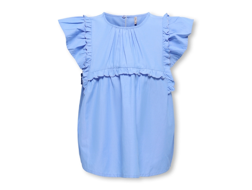Top in blue (cornflower blue) from Kids ONLY with ruffles at the shoulders and short sleeves.