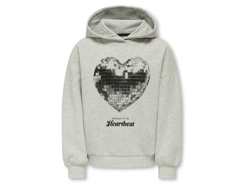 Light grey melange hoodie from KIDS ONLY featuring a large silver heart print and the text “Dancing to the Heartbeat”.
