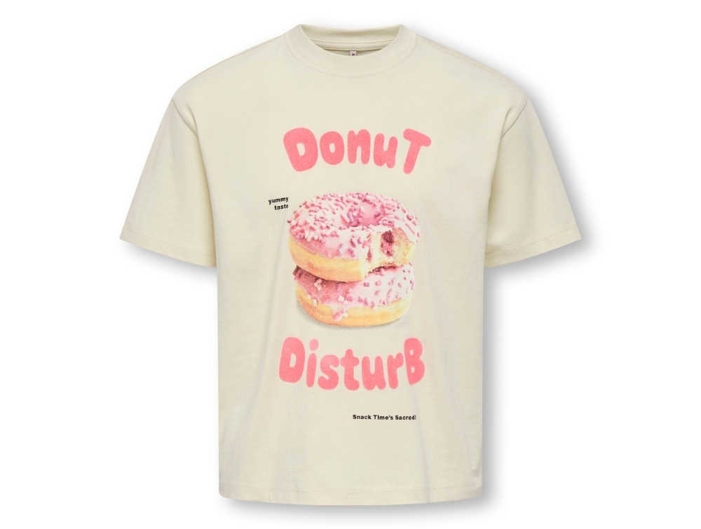 T-shirt in off-white shade (birch) from KIDS ONLY featuring a fun print of pink donuts and the text “Donut Disturb”. Made in 100% organic cotton with a round neckline, short sleeves and a relaxed boxy fit for everyday comfort.
