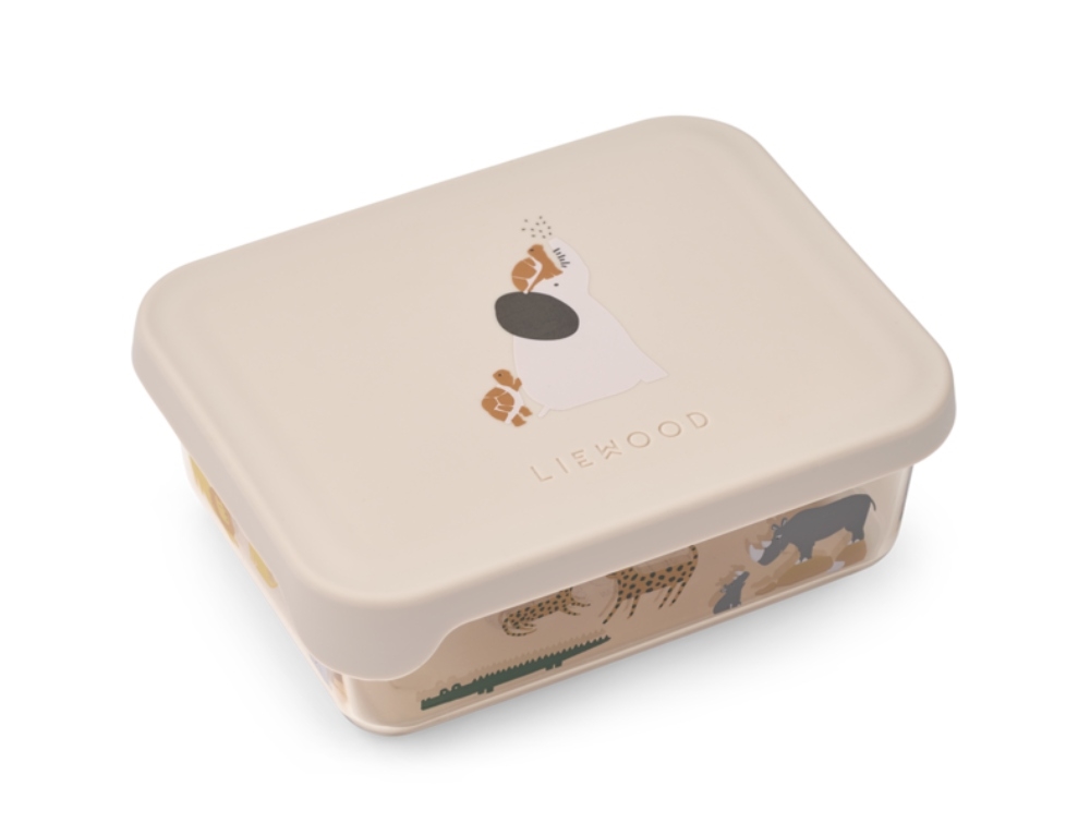 Liewood Ako snack box in sand with animal print and silicone lid