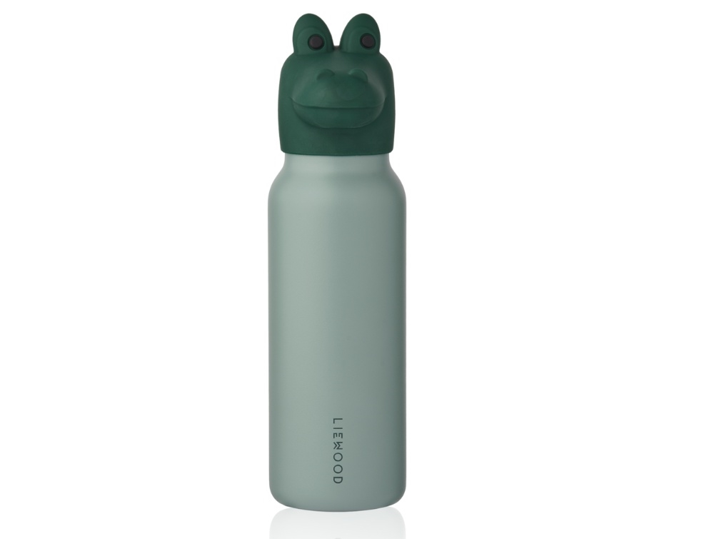 Water bottle in a green tone with crocodile lid from Liewood. The Nils bottle is made from 80% recycled stainless steel and designed for small hands to hold easily.