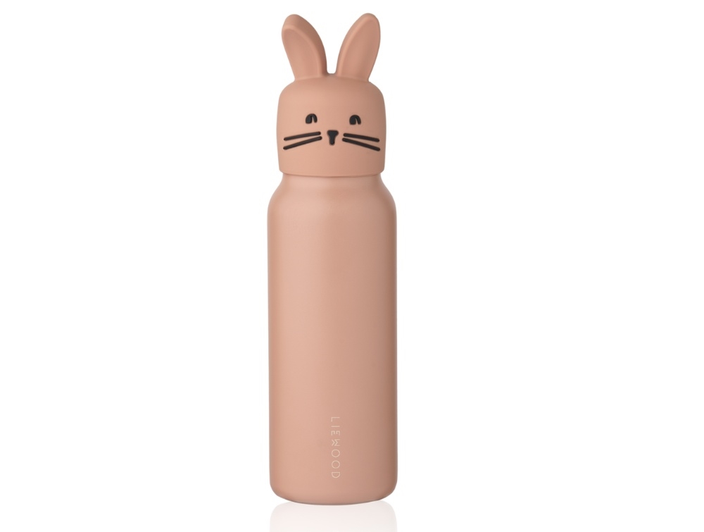 Water bottle in a rose tone with rabbit lid from Liewood. The Nils bottle is made from 80% recycled stainless steel and designed for small hands to hold easily.