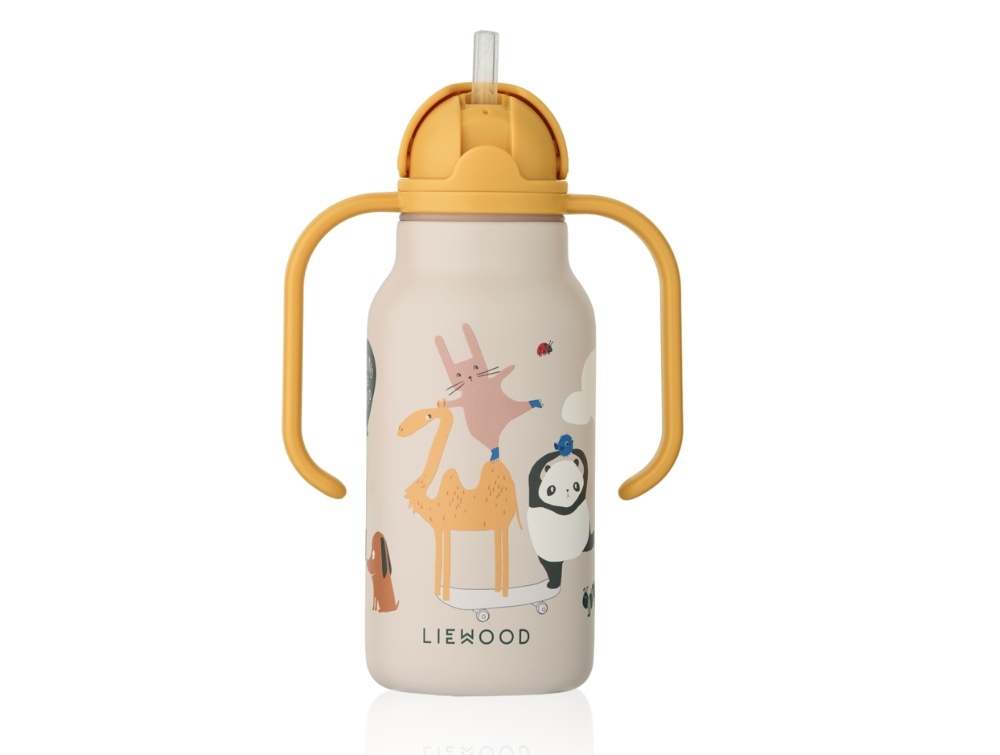 Water bottle in a beige tone with the Around the World print from Liewood. The Kimmie bottle is made of stainless steel with a polypropylene lid and silicone straw, designed for small hands.