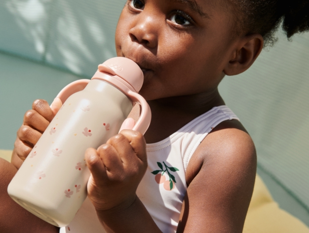 The Kimmie water bottle holds 250 ml and is designed for younger children with two handles that make it easy to hold and drink independently.