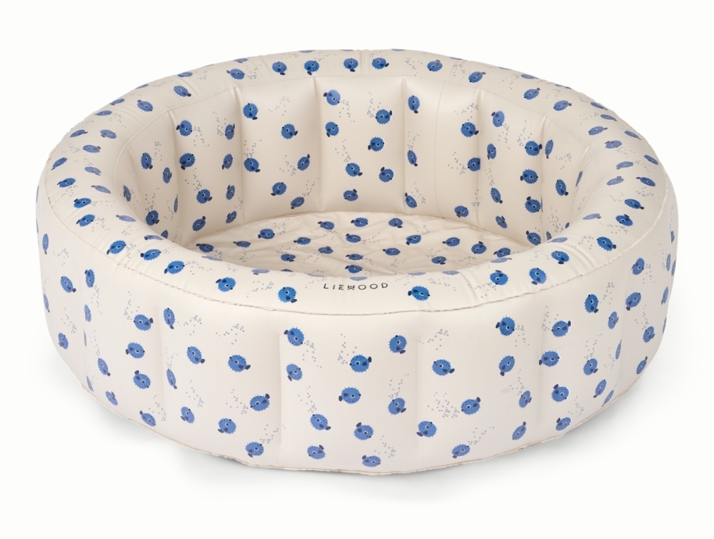 Small inflatable paddling pool in a sandy shade from Liewood with a pufferfish print.