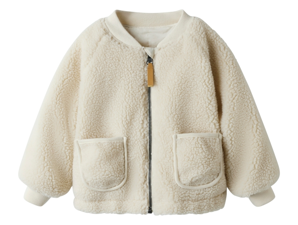 Bomber jacket in off-white shade (turtledove) from Lil’ Atelier with soft teddy look and rainbow embroidery on the back.