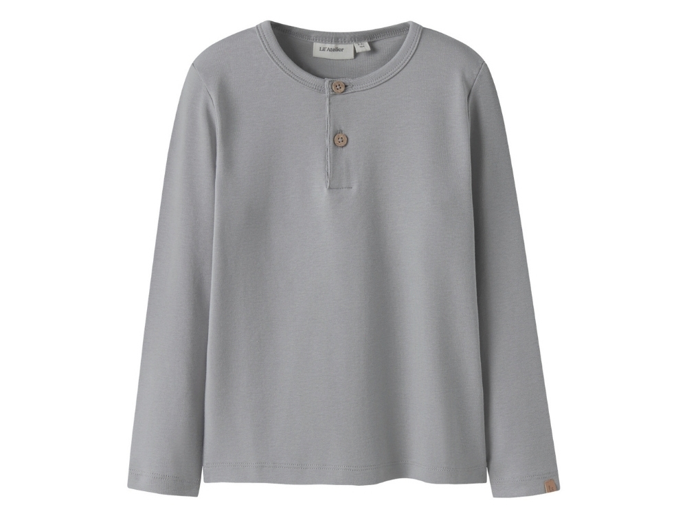 Blouse in a grey shade from Lil' Atelier with two front buttons. Designed with a round grandad neckline and made from a soft, stretchy jersey fabric that provides comfort all day long. A simple and timeless everyday piece.