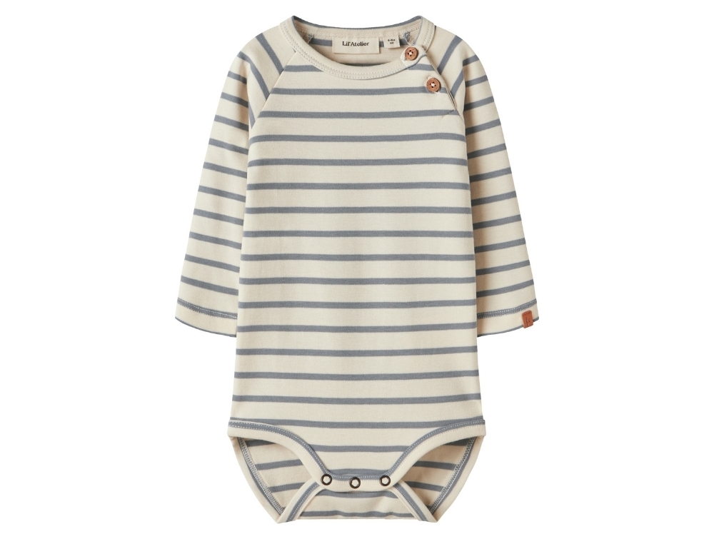 Long sleeve bodysuit in off-white shade (turtledove) with blue stripes from Lil' Atelier.