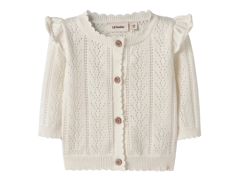 Cardigan in an off-white shade (coconut milk) from Lil Atelier with delicate pointelle pattern and ruffle details at the shoulders.