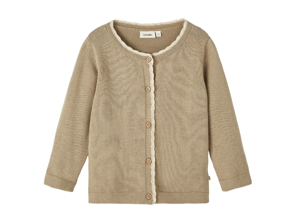 The cardigan has a round neck and long sleeves and fastens with buttons.