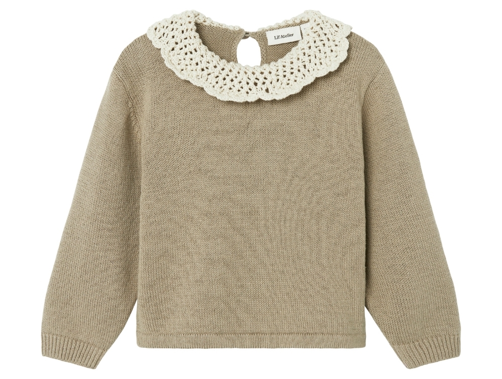 Knitted sweater in the color chinchilla with a lace pattern collar from Lil' Atelier.