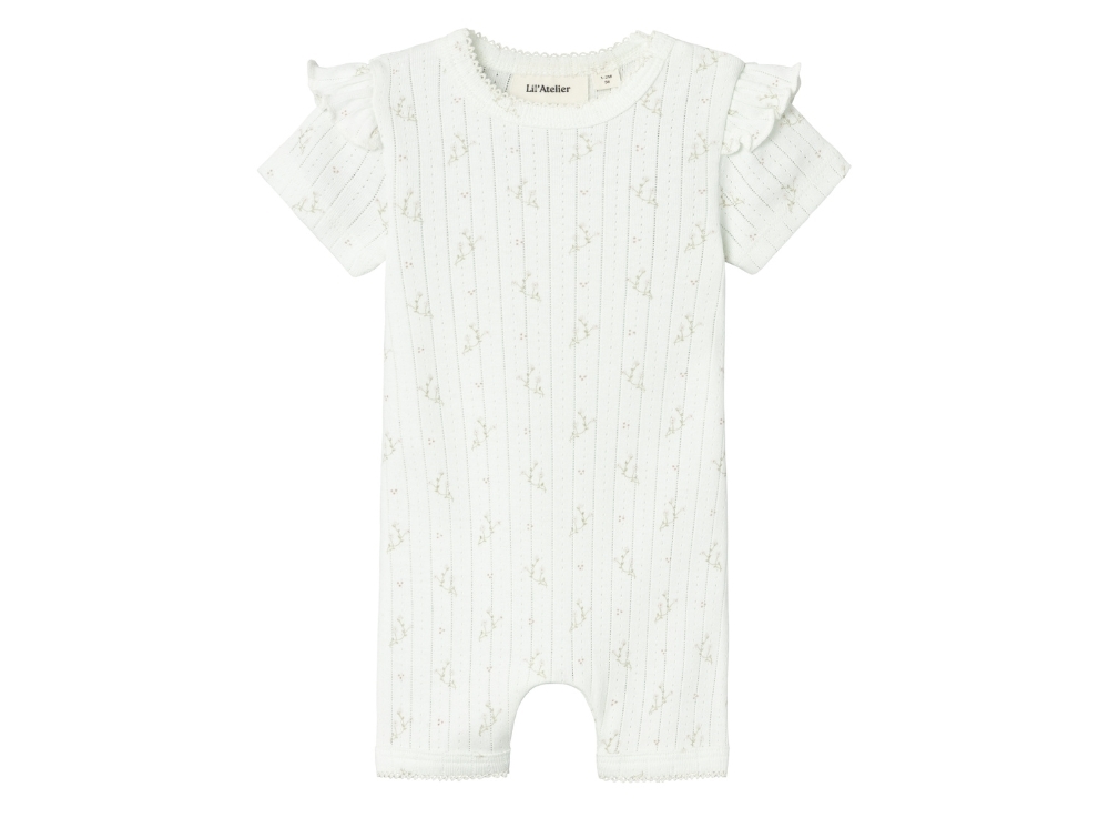Short-sleeved and short-legged romper in the color coconut milk with print and ruffles from Lil' Atelier.