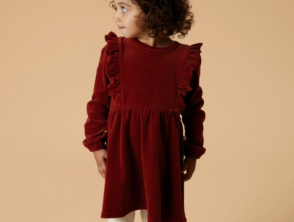 Dress in deep red shade (red dahlia) from Lil' Atelier. Made in soft velour, it features long sleeves with elastic cuffs, a round neckline and delicate frill details at the front. Closed at the back with a button at the neck.