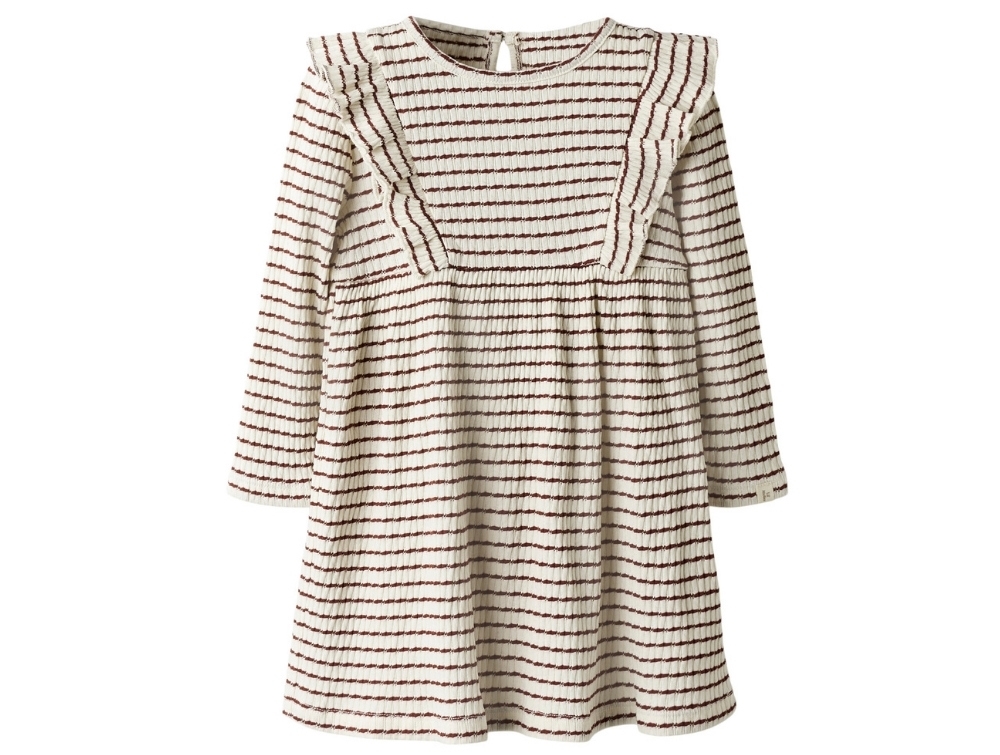 Dress in off-white shade with brown stripes from Lil' Atelier. The dress features long sleeves, a round neckline, and cute frill details on the front. Closes with a button at the back.