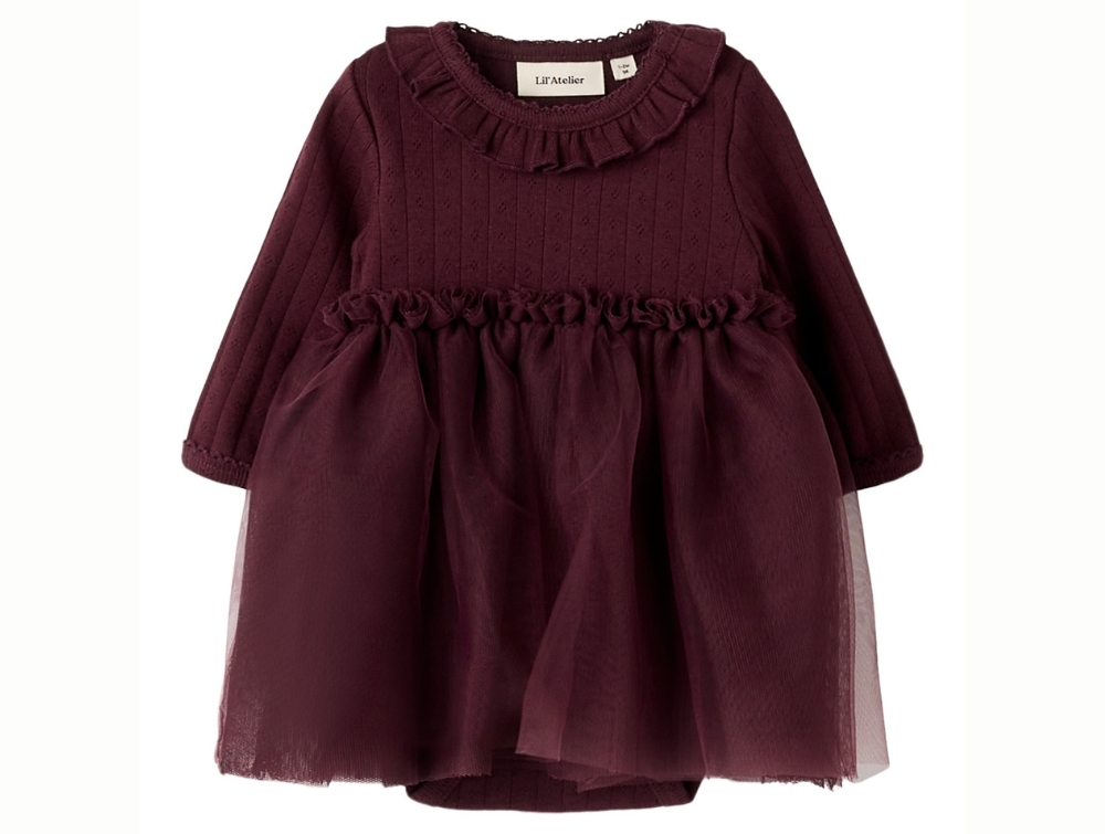 Body dress in a bordeaux red shade (catawba grape) from Lil' Atelier featuring a soft upper fabric, long sleeves and a delicate tulle skirt.