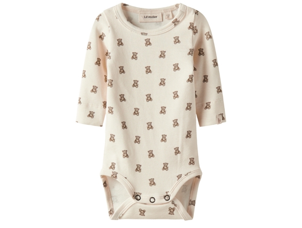 Bodysuit in off-white shade from Lil' Atelier with a cute all-over teddy bear print. A soft and stretchy everyday basic for little ones.