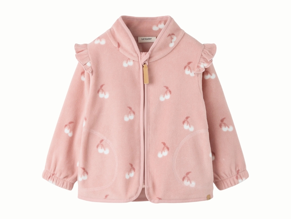 Lil' Atelier fleece jacket misty rose with ruffles and cherry print