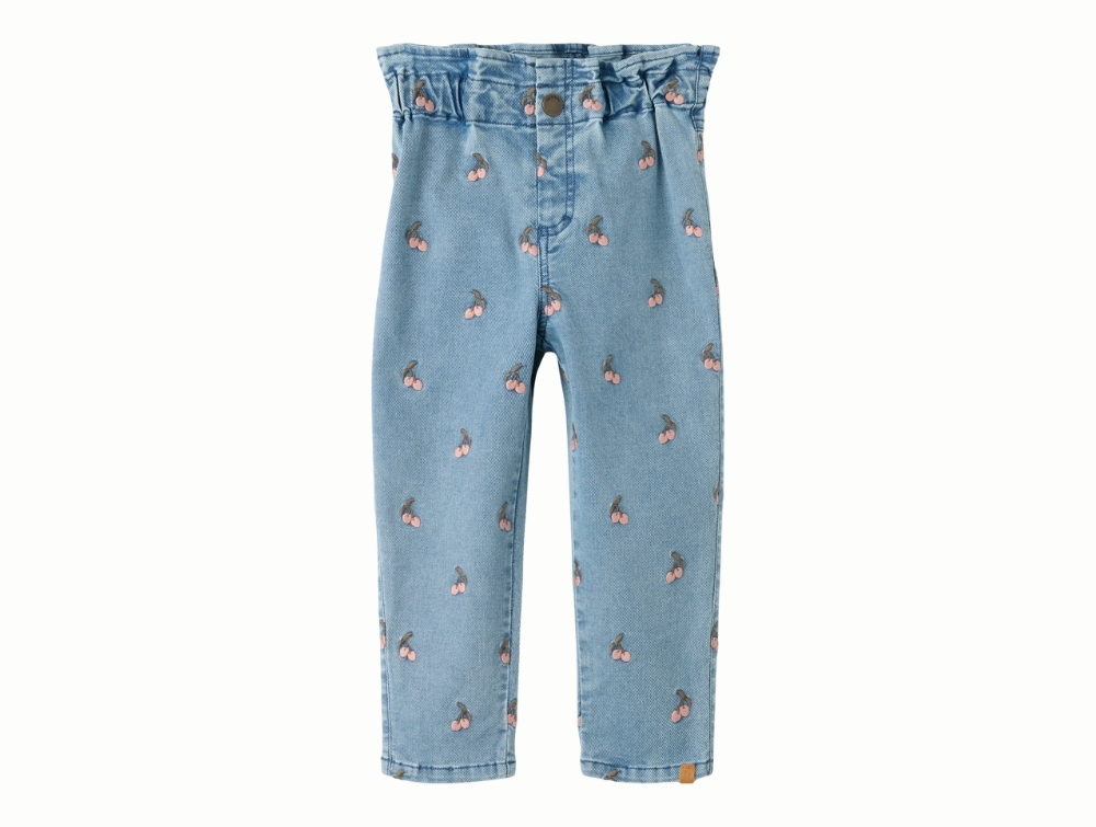Jeans in a blue shade from Lil' Atelier with small embroidered cherries.