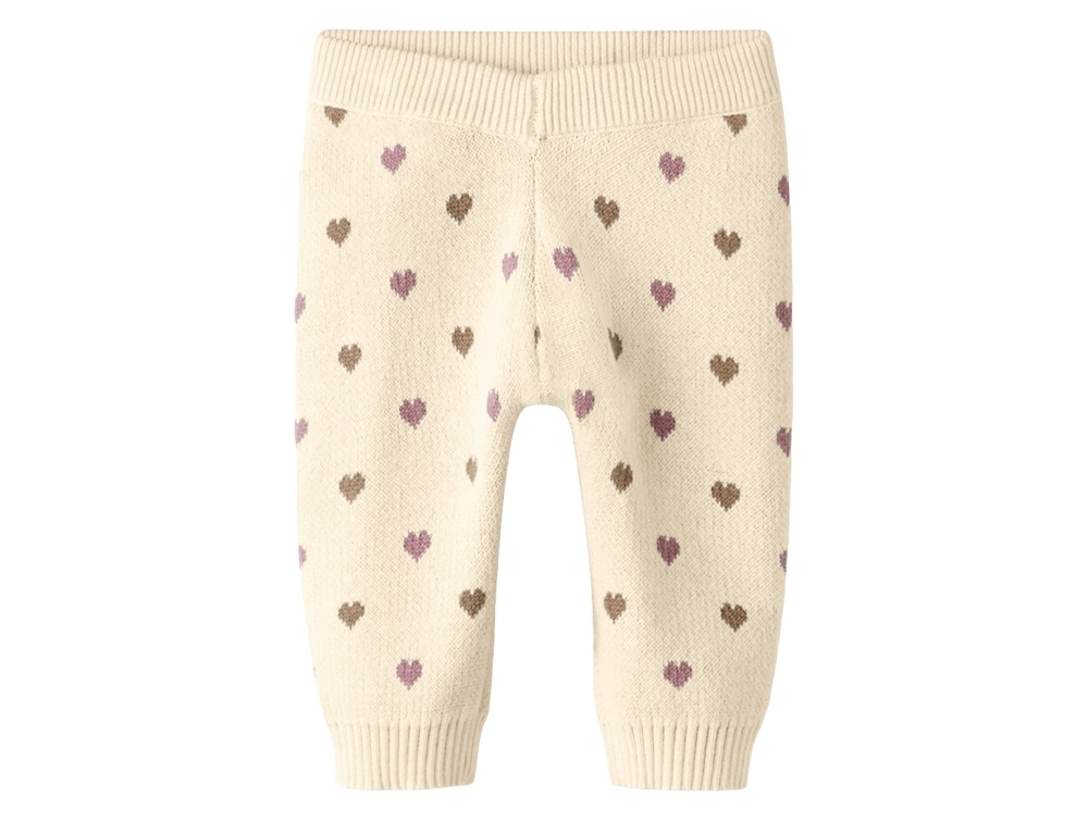 Knitted trousers in off-white shade (turtledove) from Lil' Atelier with small hearts in brown and purple tones.