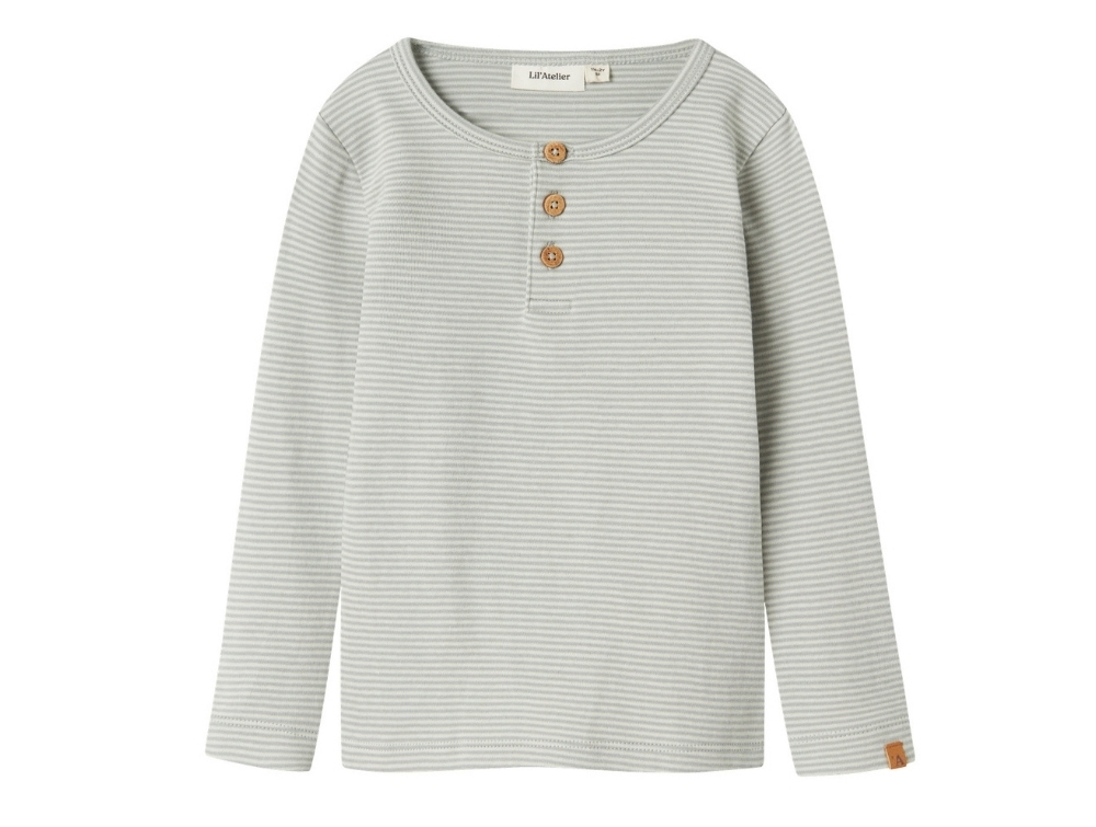 Top in light green shade with fine stripes from Lil' Atelier. The top features a grandad neckline with three buttons and long sleeves. Made from 100% organic cotton in a soft jersey quality that feels gentle on the skin.