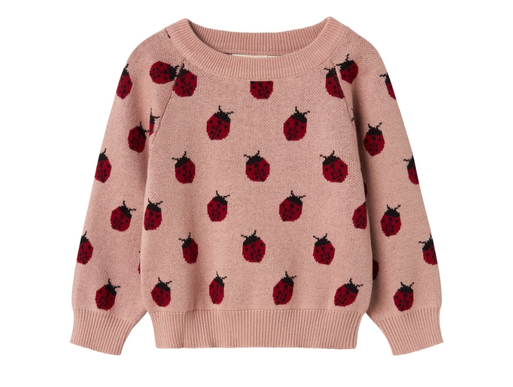 Knitted sweater in pink shade from Lil' Atelier featuring a cute ladybug pattern in red and black tones. Soft and comfortable with round neckline, long sleeves and ribbed edges.