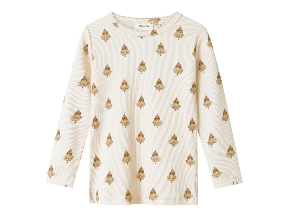 Ribbed long-sleeved top in beige with clown print from Lil' Atelier. The top has a round neckline and a slim fit, ideal for everyday wear.