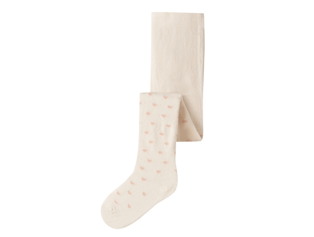 Tights in an off-white shade with pink hearts from Lil' Atelier. These soft tights feature an elasticated waistband for a secure and comfortable fit. The jacquard-knit design with hearts adds a sweet and timeless touch.