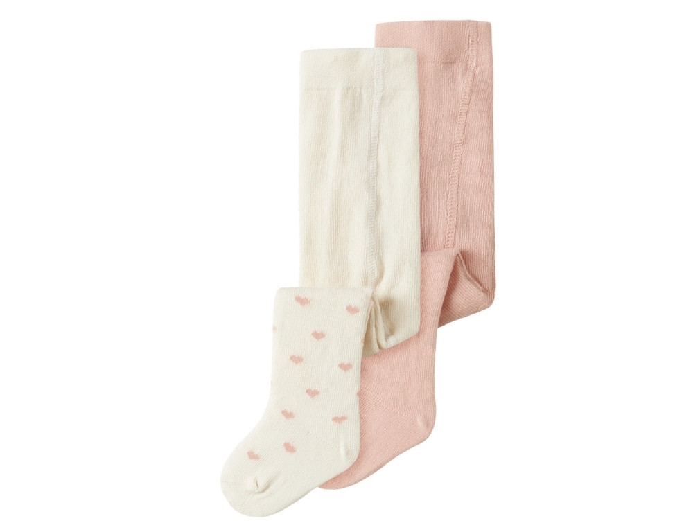 2-pack of tights from Lil' Atelier in off-white and pink shades. The set includes one pair with pink heart pattern and one solid pair in cameo rose. Both pairs are made from soft, stretchy fabric with an elastic waistband for a comfortable fit.