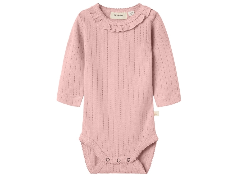Body in pink shade from Lil' Atelier featuring a frilled collar and delicate eyelet rib texture. It has long sleeves and snap buttons at the shoulder and bottom for easy dressing.