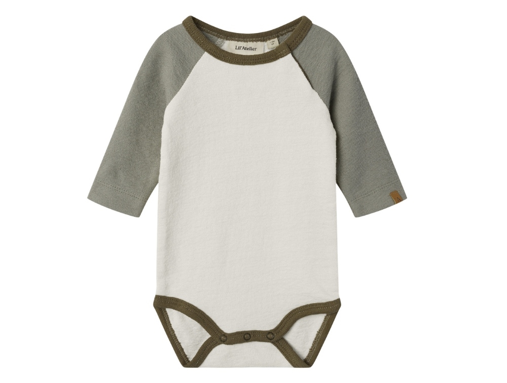 Baby bodysuit in off-white (turtledove) from Lil' Atelier with green sleeves. Made from 100% organic cotton jersey that feels soft and gentle on the baby's skin.