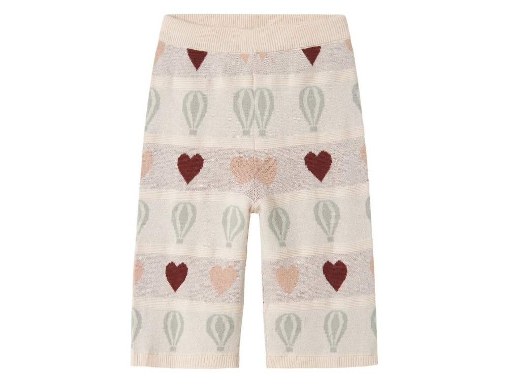 Trousers in cream shade from Lil' Atelier featuring a jacquard knitted pattern of hearts and hot air balloons in soft pastel tones. The style has a wide fit with cropped legs and an adjustable waist for extra comfort.
