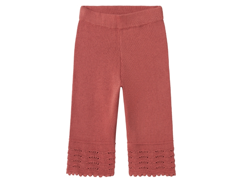 Pants in dusty rose shade from Lil' Atelier featuring delicate lace details at the hems. The knitted trousers have an elastic waistband and a classic design, making them easy to pair with other styles.
