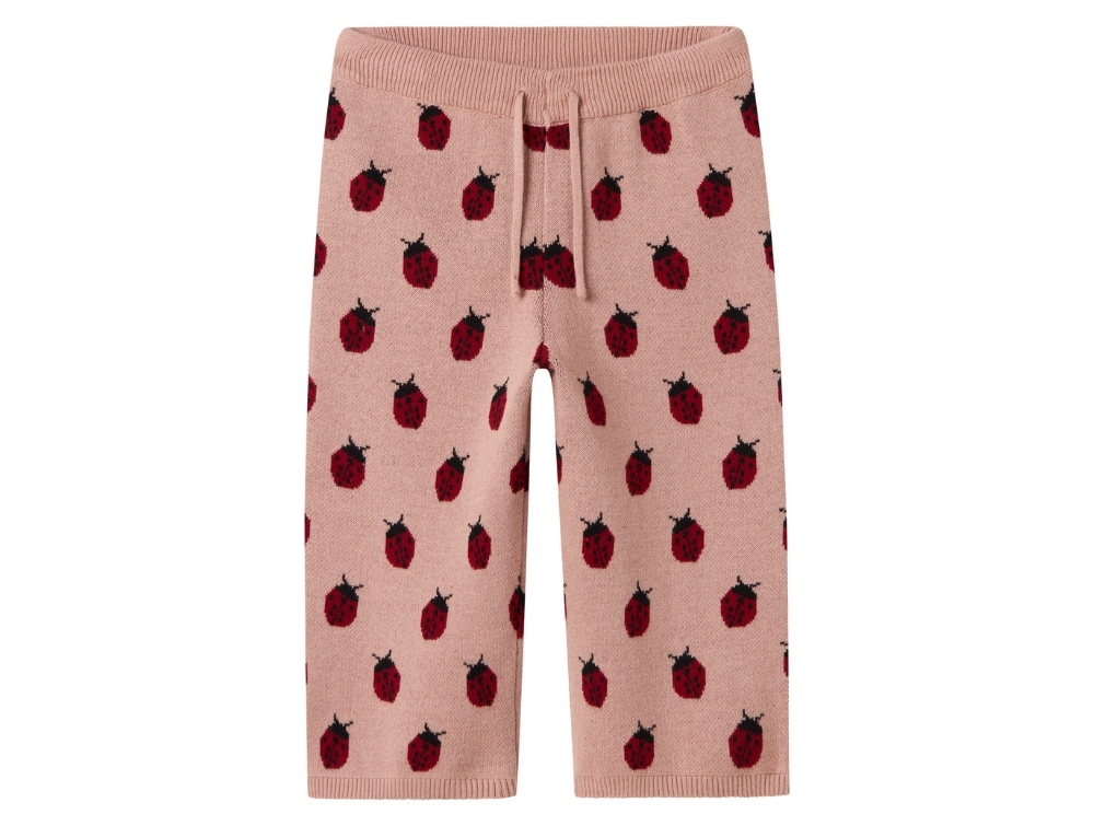 Pants in pink shade from Lil' Atelier featuring a lovely ladybug pattern. Knitted wide-leg design with adjustable elastic waist and fixed drawstring.