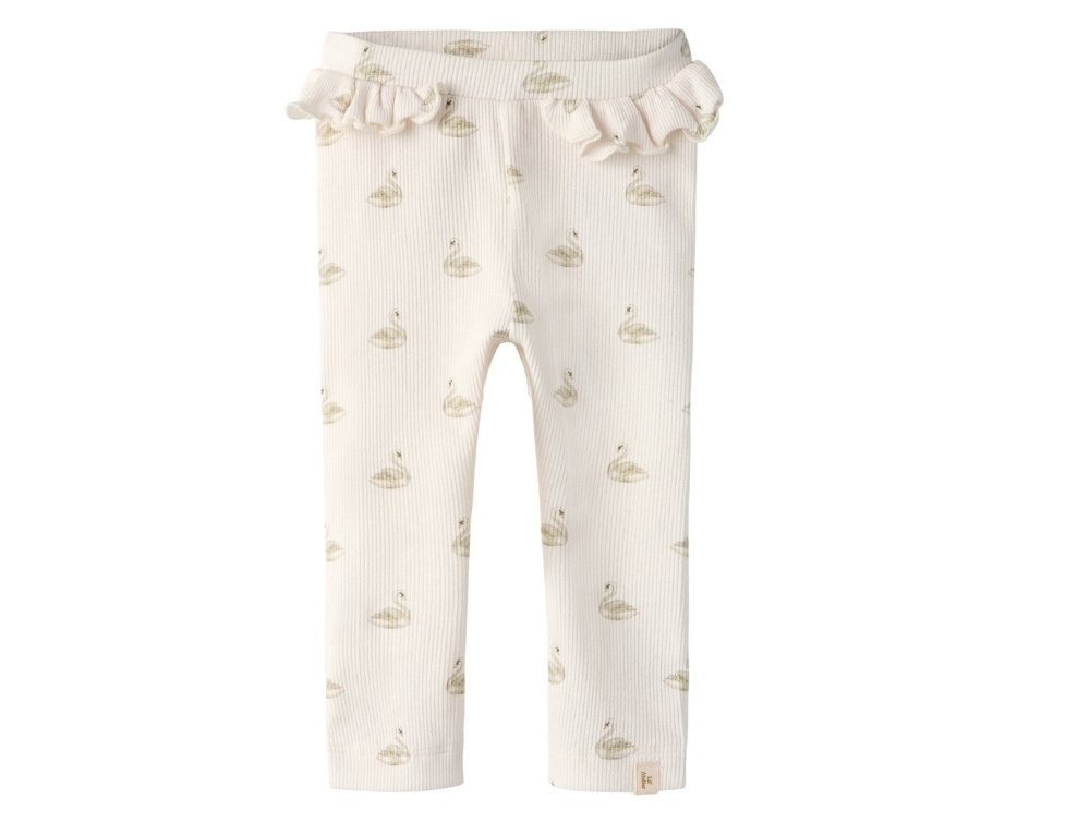 Ribbed leggings in beige shade with swan print from Lil' Atelier. The leggings feature an elasticated waistband and a cute frill detail for a soft and feminine look.