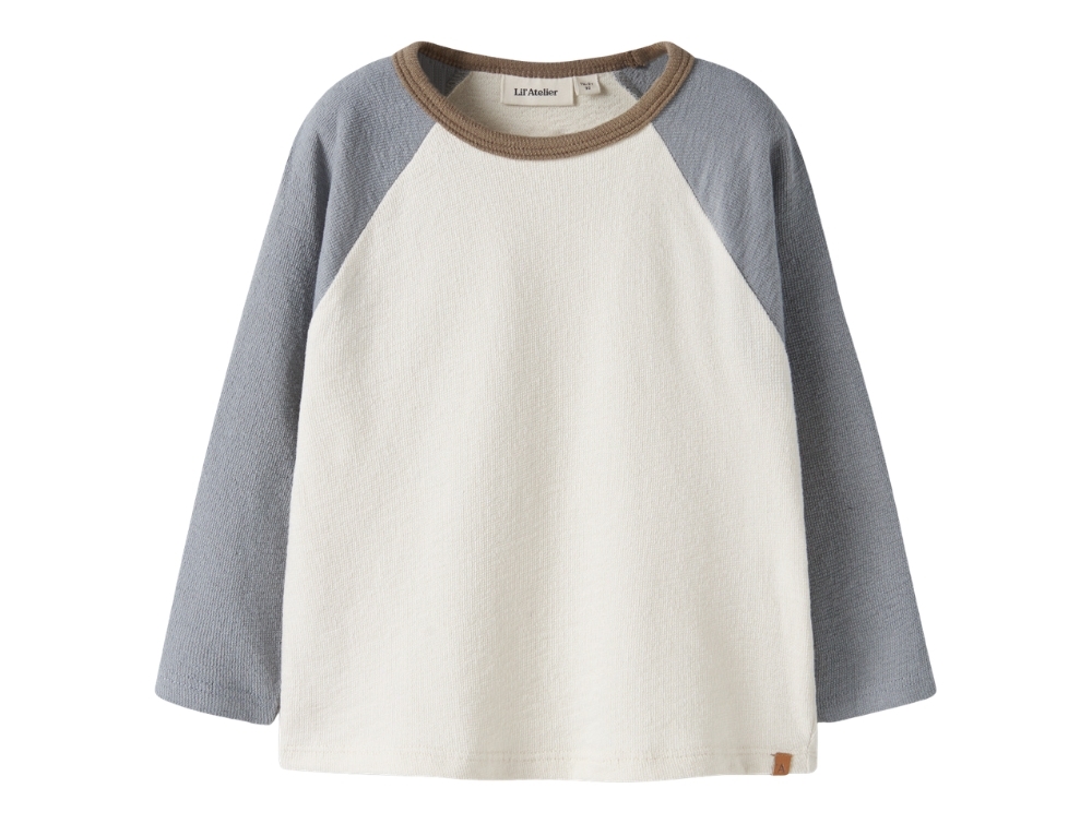 Designed with contrasting raglan sleeves in a dusty blue shade and a round ribbed neckline.