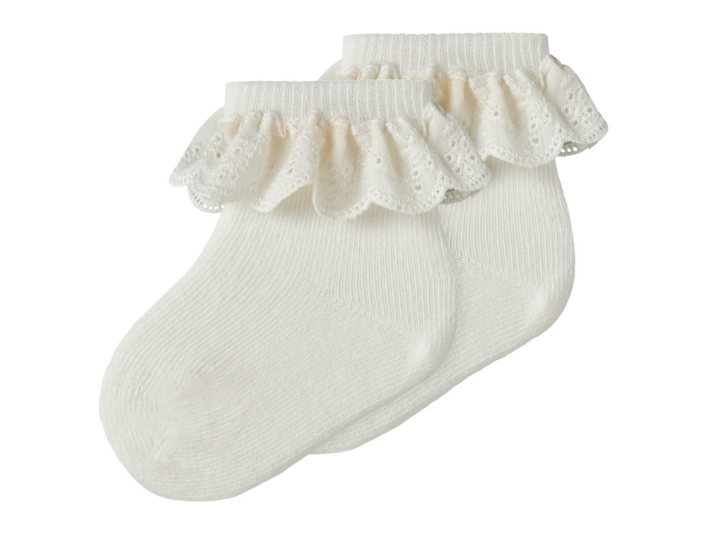 Socks in a 2-pack in an off-white shade (coconut milk) from Lil' Atelier with decorative lace trim.