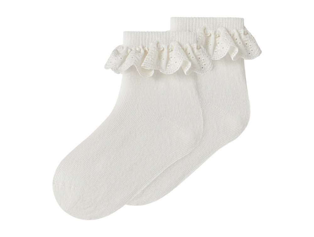 Socks in a 2-pack in an off-white shade (coconut milk) from Lil' Atelier with decorative lace trim.