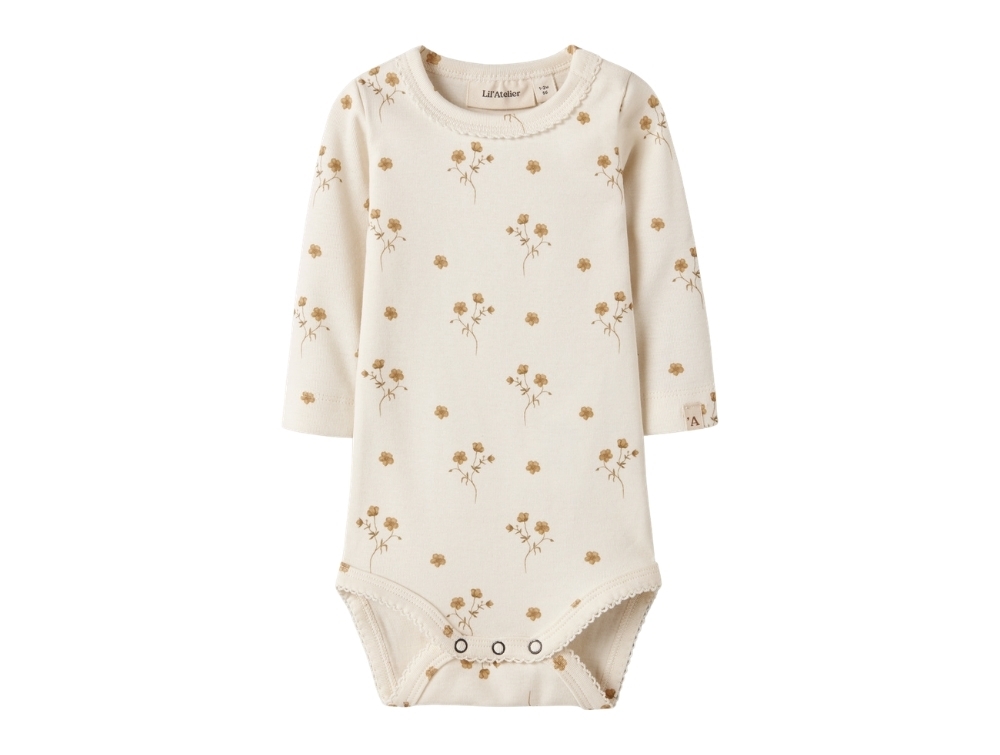 Bodysuit in an off-white shade (coconut milk) from Lil' Atelier with small floral print in warm golden tones.