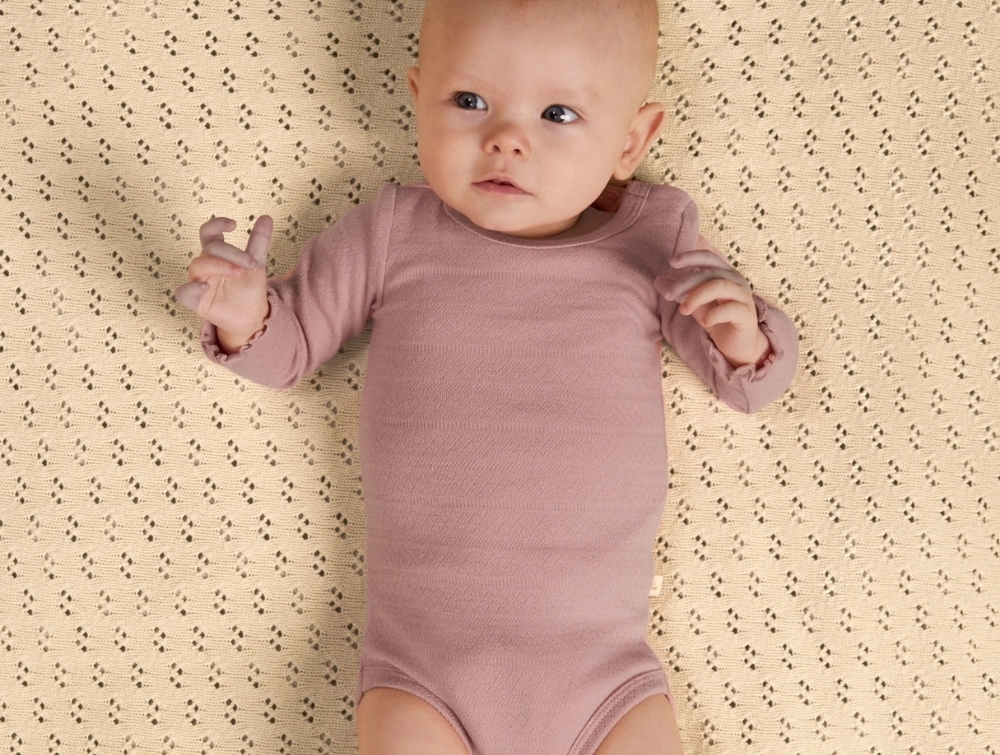 Bodysuit in a soft pink shade (misty rose) from Lil' Atelier with delicate needle drop pattern.